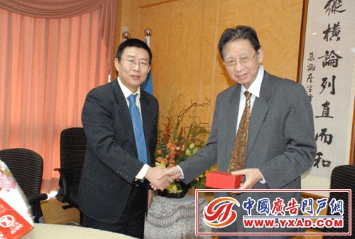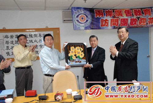 前台湾广告公会理事长、现任南荣科技大学副董市长沈达吉,向交流团赠送珍贵礼物。