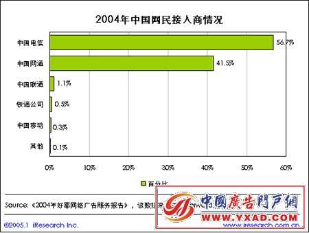 根据好耶联合iResearch发布的《2004年好耶网络广告服务报告》的数据显示:2004年中国网民最主要的接入商是中国电信,其次是中国网通和中国联通。好耶的Adforward广告管理系统平台是目前中国使用较广泛,市场占有率较高的网络广告发布管理软件。它不仅可以对网络广告形式、广告点击率等进行监测统计,也可以对网民的一些网络习惯进行统计分析。通过Adforward的统计数据,能帮助广告主或广告代理公司清楚了解网民的网络访问习惯,制定出比较合理的媒体投放计划。艾瑞市场咨询