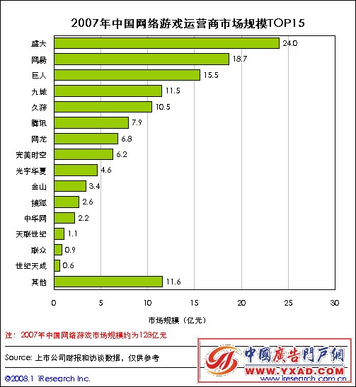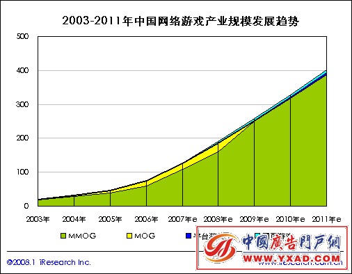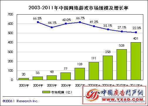 根据iResearch艾瑞咨询最新推出的《2007-2008中国网络游戏发展报告》数据显示,2007年中国网络游戏市场规模为128亿元,同比增长66.7%.预计在未来的4-5年间,网络游戏还将继续保持20%以上的增幅,在2011年整个市场规模将达到401亿元。艾瑞认为,网络游戏的快速发展主要得益于中国庞大的用户基数与游戏运营商对用户的深度挖掘。