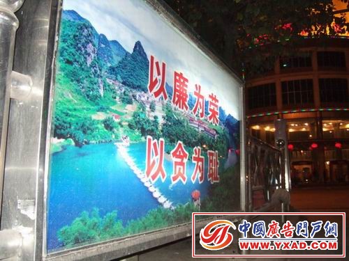 今年初,宜州市在城区街道的繁华、显眼地段,树立了数块廉政灯箱广告牌,内容有“三姐故乡山水美,清正廉洁人欢畅”、“加强廉政文化建设,筑牢思想道德防线”、“立党为公志不移,廉政为民是根基”、“以廉为荣,以贪为耻”等,以此促使广大党 员干部和群众从中接受廉政勤政的熏陶,营造了浓厚的清正廉洁氛围。图为宜州市城中中路的一块廉政灯箱广告牌。