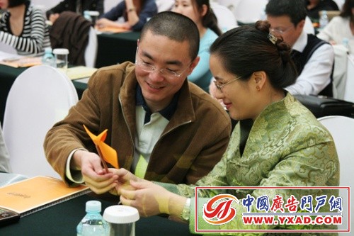 此次说明会,山东电视台别出心裁地在每一位来宾的桌上都摆放了小风车。让来宾共同折叠小风车,为公益喝彩。上图为到场嘉宾在折叠橘色的小风车。