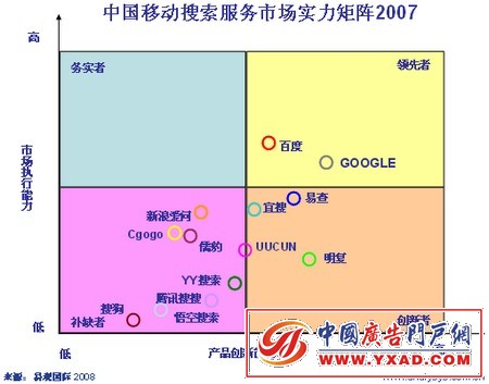 据易观国际最新报告《中国无线搜索市场实力矩阵专题2008》研究结果发现:2007年随着互联网搜索引擎厂商的进入,中国移动搜索厂商的市场占位和用户争夺更加激烈。总结2007年无线搜索产业的关键成功要素为:合作力度、营销推广、技术及服务、渠道及代理商。易观国际根据产业成功要素对典型的移动搜索厂商进行分析,根据实力矩阵模型总结出2007年移动搜索市场的竞争格局,如下图: