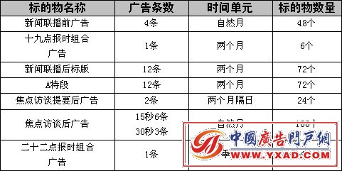 ·为进一步为招标企业提供更好的广告投放环境,分别对部分标的物和套售广告时段进行了主题包装:(1)“新闻联播前广告”播出形式调整为“30秒‘庆贺新中国成立60周年’宣传片片尾企业同贺标版 + 4家企业15秒广告”。(2)CCTV-1部分定向套售广告时段专设“2009,CCTV与您携手同赢”主题套售版块。各标的物配置的晚间定向套售广告时段及部分白天套售广告时段均采取主题包装版块形式播出。