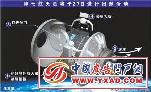 飞行进入出舱活动段后,01号和02号航天员进入轨道舱,03号航天员则留在返回舱,负责飞船监测和地面联络。01号航天员翟志刚将穿上中国研制的“飞天”舱外服,出舱回收试验样品并进行舱外行走。据预计,整个太空行走从打开舱门起算,到关上舱门约有半个小时到40分钟左右。如果仅指航天员在舱外的活动时间,大概有20分钟左右。