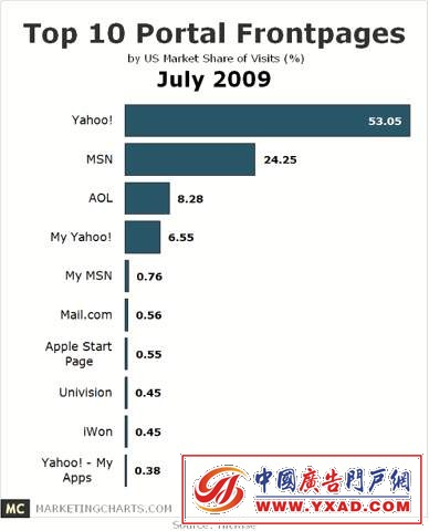 北京时间8月11日上午消息,据国外媒体报道,市场研究公司Hitwise今天发表报告称,在美国十大门户网站首页中,雅虎首页访问量最高,在总流量中的份额为53.05%。
