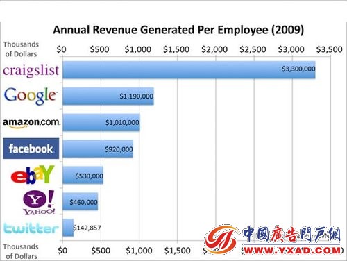 全球最大的社交网站Facebook排名第四,员工总数为1200人,公司年营收额为11亿美元,平均每位员工的年产值为92万美元。电子商务平台eBay排名第五,员工总数为1.64万人,公司年营收额为87.3亿美元,平均每位员工的年产值为53万美元。雅虎排名第六,员工总数为1.39万人,公司年营收额为64.6亿美元,平均每位员工的年产值为46万美元。微博网站Twitter排名第七,公司仅有员工175人,年营收额为2500万美元,平均每位员工的年产值为14.3万美元。