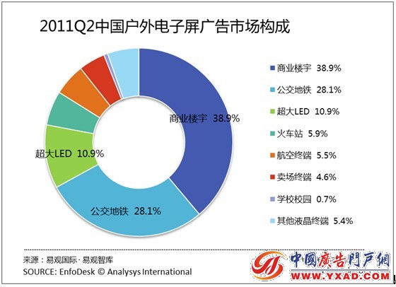 根据易观国际EnfoDesk产业数据库《2011年第2季度中国户外电子屏广告市场监测报告》显示,2011年第2季度,中国户外电子屏广告市场规模达到15.7亿元,公交地铁市场略有涨幅,达到28.1%,其他细分市场份额变化不大。