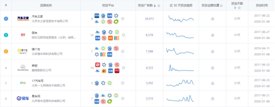 通过该功能,可以看到汽车之家、团车、弹个车这三个汽车品牌广告主在2019年12月强势抢量。