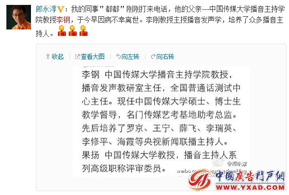 央视名嘴郎永淳于13日下午一点左右发布的了李老师离世的消息,称他接到李钢教授儿子的电话,得知了李老师去世,并通过微博表示悼念,众多网友点燃红烛祝愿李刚老师一路走好。
