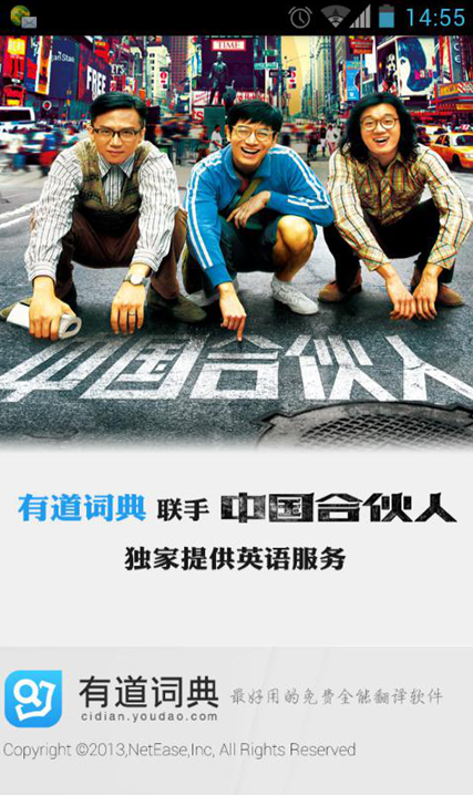网易有道词典作为电影《中国合伙人》的独家英语服务提供方。通过丰富的合作形式,全程参与到影片的发行、宣传、传播阶段。为影片提供多样的传播与互动手段。