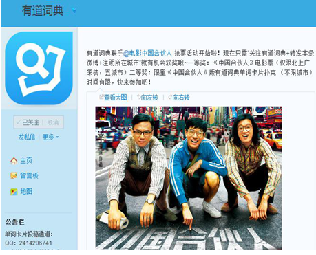 将有道词典的线上资源与《中国合伙人》的线下资源有效整合,实现联合推广。
