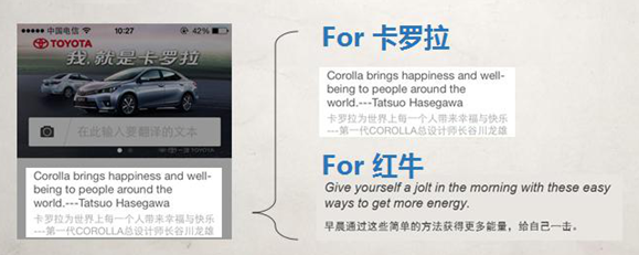 原生句:网易有道词典原生营销,依据品牌slogan及本身品牌调性,定制专属品牌每日一句,日均千万级PV量带动大范围高度曝光,点击背景图进入内页收听例句发音,即可对品牌进行二次记忆。iPhone+Android有道词典首页日均PV2100万。