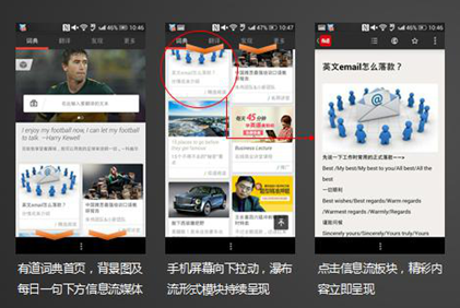 有道信息流媒体:它并不是简单的图文展示,信息流媒体作为有道词典特于色产品之一,软性推广中起到至关重要的作用PC、Mobile、Ipad多平台打通,同步更新;日均总PV:2100万,日均总Click:500万;用户来到网易有道词典主动抓取与学习相关信息,使得软性广告更易传达;多个栏目共同承担传播重任,活动、导流、曝光、品牌塑造一应俱全;文章内容深度定制,使品牌赢销商海。