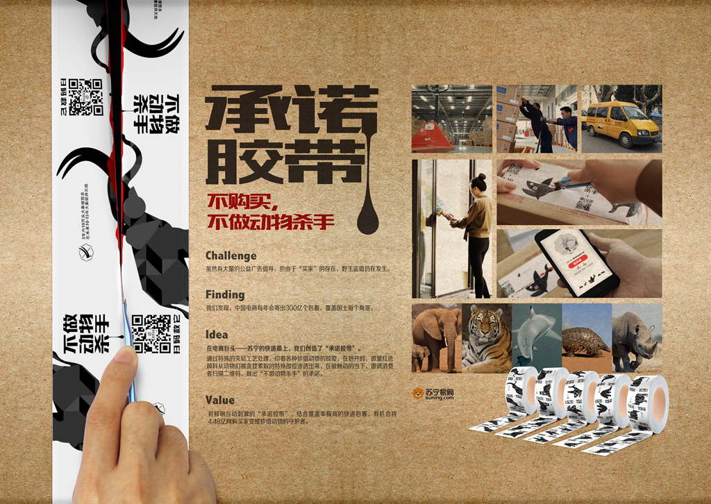 目前,凤凰网的“社会设计”理念已初见成效:凤凰网与苏宁易购、生米组成联合打造的“承诺胶带”项目,将保护动物这一司空见惯但又迫在眉睫的公益诉求应用于亿万个电商物流包裹之上,采用两层特殊工艺制成的封箱胶带纸,在划开时会出现像血一样的红色颜料,让消费者瞬间如同动物被杀害的现场,扫码做出“不购买,不做动物杀手”的承诺。迄今,该案例横扫了包括戛纳国际创意节铜奖,长城奖、金投赏全场大奖等重要荣誉。