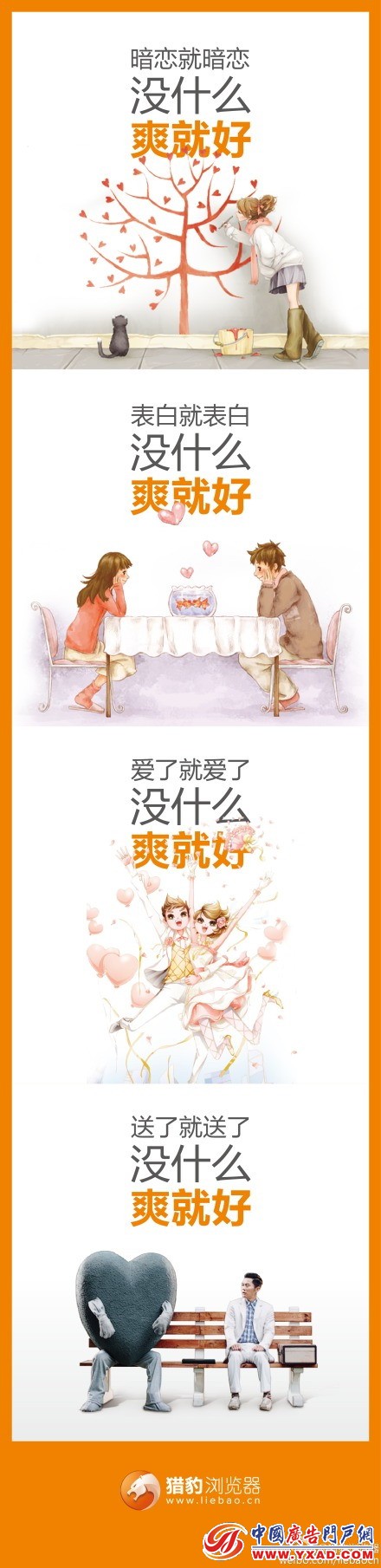 该广告片中李晨的形象以阿甘为原型,表达简单面对生活的诉求。在个人微博中,李晨也发布内容表示:“年前在上海拍了一支猎豹浏览器 的广告,说了点石头的事情。一块石头,有人一笑而过,有人冷嘲热讽,有人落井下石。我怎么看?石头可以拿在手上,但别压在心里。总有人愿意用简单的方式面对世界,阿甘,向你致敬。没什么,爽就好。”随后,猎豹浏览器还通过李晨个人微博发布了有奖征集活动,调侃集齐7块石头召集神龙的段子,称将由猎豹送出101块心形石头。