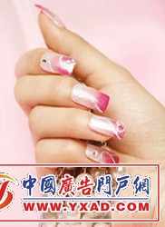 A.底色是透明感非常好的粉色指甲油,在指甲前端涂抹带有光片的指甲油,贴上水钻。