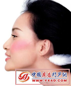 上完粉底后,用手指蘸膏状腮红,淡淡地在颧骨处晕匀后上蜜粉,最后上与膏状腮红颜色相近的粉状腮红即可。