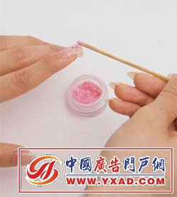 用尖头木棍沾点粉色亮粉抖落在亮油上,晾1分钟就粘好了。