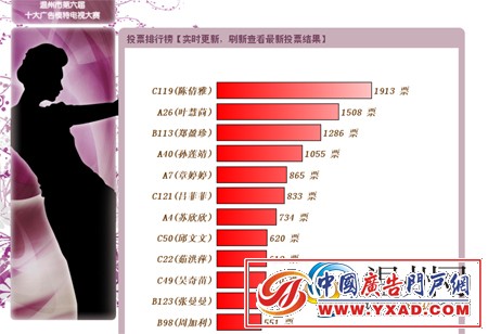 温州网7月9日消息:火热夏天,火热激情,温州市第六届广告模特大赛海选投票竞争激烈,7月5日还位居“人气王”位置的A007章婷婷目前已被C119号陈倩雅取代,截止7月9日晚十点为止,C119号陈倩雅以1913的票数暂居第一。