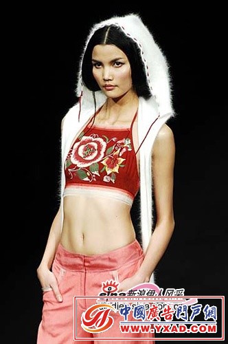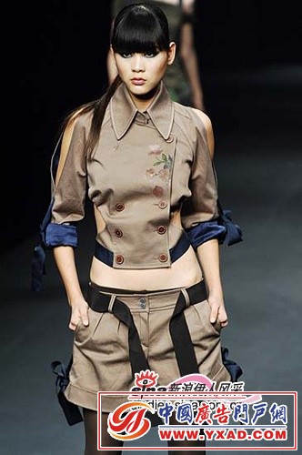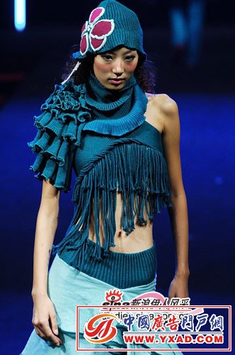 流苏式的编织上装显得模特的腰部更加纤细,肩头夸张的装饰强调了腰部的婀娜