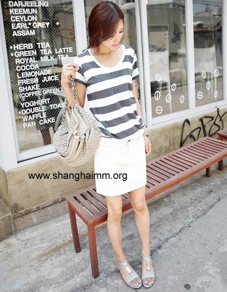 灰白横条纹设计的短袖T恤与简洁白色短裙的组合,显得清爽自然,尽显清新甜美的夏日风味。