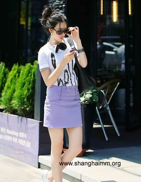 白色涂鸦设计T恤+紫色高腰窄裙的搭配,鲜明的颜色对比,看上去非常亮丽有型,很是值得夏日穿搭哦!