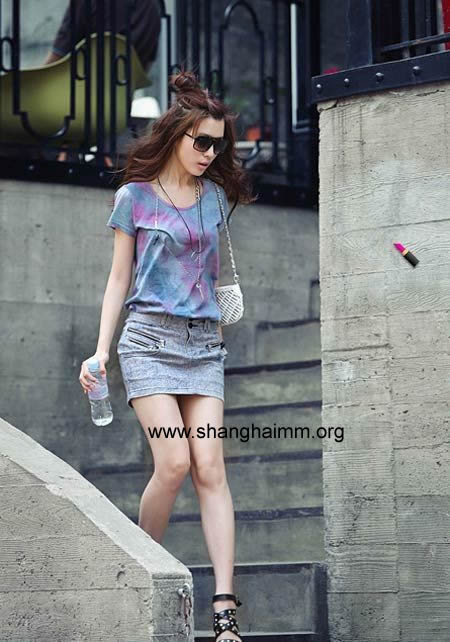 扎染设计的T恤与牛仔短裙搭配,别具风情的颜色运用,让您的时髦指数立刻上升,尽显夏日都会女郎风!
