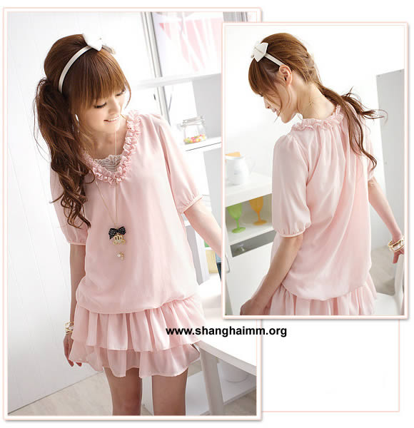 时尚解析:洋溢着甜美淑女气息的荷叶V领五分袖雪纺洋装,精致可爱的荷叶滚边V领设计,从视觉上营造出甜美浪漫的氛围,同时还能让您的脸型看上去更加小巧迷人;蓬蓬裙的下摆设计,赋予这款洋装一丝动感活泼韵味,无论是单穿或是搭配七分牛仔裤,都亮丽有型,是喜欢日系装扮风格的女孩们初夏时节的必败单品喔!