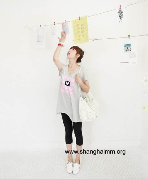 服饰解读:卡哇伊爱心宽版素色长Tee,宽松舒适的剪裁,搭配胸前可爱的爱心图案印花,显得俏皮又休闲,与下半身的七分打底裤搭配,勾勒出修长的腿部线条,随性休闲的穿搭风格,走在夏日街头一定会让您的人气大增喔!