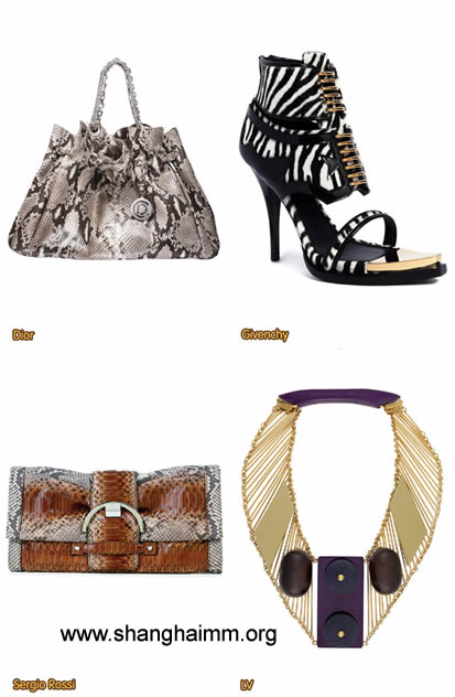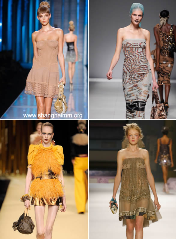 Louis Vuitton服装以金色丝绢与黑丝缎垫肩外套,搭配蛇皮、皮革滚边的铆钉装饰橘色皮裙,裙后摆缝上蕾丝,娇艳风情四溢。和服式短外套腰间围上黑色珠子拼图、闪亮珠片、蛇皮或Monogram提花图案腰封,华丽抢眼。而Dior秉持着一贯的奢华与优雅,透过编织、动物图纹、华丽的刺绣图案,娇魅抢眼的演绎着属于2009年全新的部落时尚。