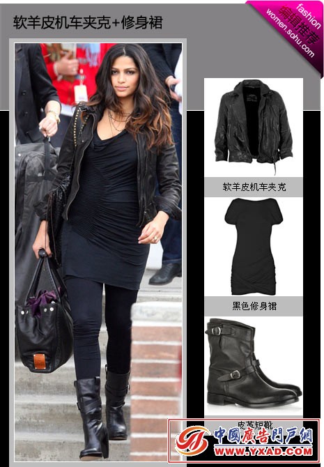 搭配建议:帅气有型的机车夹克内搭超修身小黑裙,帅气的外表下有一颗温柔的心。抽褶的设计更显层次感。扳扣小短靴潮味儿十足。