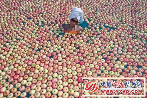 2007年5月13日,马来西亚吉隆坡,当地一家酒店内,一名模特在水池中和20000只苹果在一起。该举动试图打破一项马来西亚纪录,即“使用苹果数量最多的一次水疗”。
