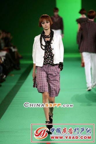 如果有一件花哨的夏季外套让女人们沉迷不已,Christian Lacroix很可能就是祸首之一。那曾经浓得化不开的巴洛克式华丽在2007年的春夏溶解于几分简约的娇俏之中。满目青绿的T型台率先带来春季户外的奢华休闲。黑白几何图案的束带提花外套,长及肘部的泡泡袖,灰色的短夹克与宽腿裤……也许是为了给温实的秋冬一个过渡,首先出场的服饰略嫌朴素,让人不禁疑惑是不是走错了秀场,那个以华贵非凡、千娇百媚而著称的Christian Lacroix难道也收敛了风格?而模特颈项上繁复而夸张的珠石项链隐约诉说着不甘寂寞的华美,慢慢地,从黑白光影转换成嫣红的民族风,期盼已久的绚丽印花终于登场了。