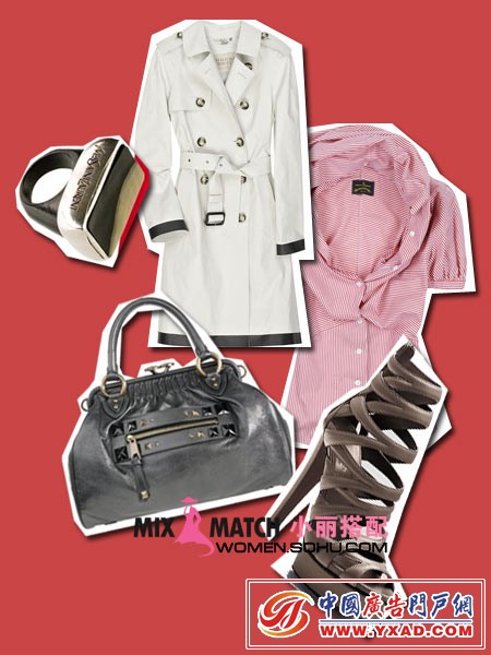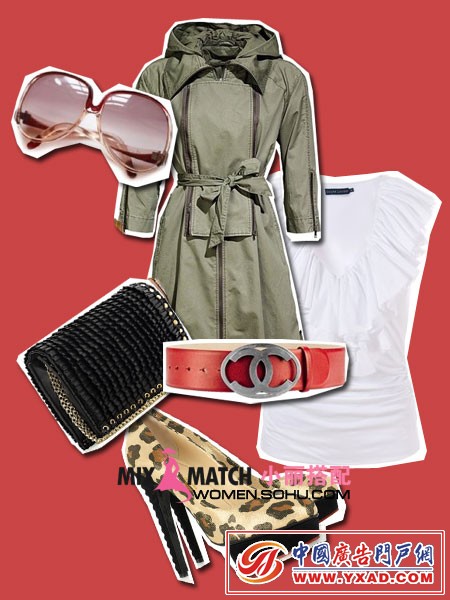 搭配建议:对于腰部线条不够完美但有一双美腿的女性,无袖、收腰、下摆放开的军装风格连衣裙式风衣最适合。红色腰带为整体增添不少光彩,足够抢眼。
