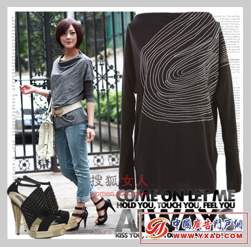 蝙蝠袖剪裁特别的一款T恤。个性坠领,抽象的图案,搭配腰带修饰腰身突显女人味。与牛仔的搭配就是绝搭。