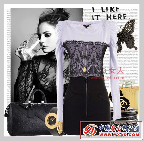 拼接蕾丝的一款T恤,袖子的打褶设计,回归T台耸肩造型。搭配短裙,干练职业的都市OL就出来了。