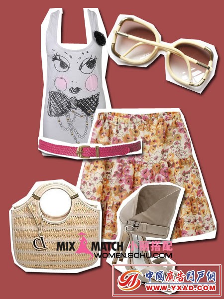 搭配建议:卡通图案背心搭配水花短裙,展现女人成熟一面也隐隐的透露她们都有一颗纯真的新,编织手袋洋溢暖暖春意。