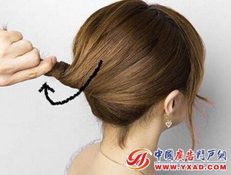 step4、扭转至发尾,马尾向上塞进头发里面,以看不到发尾为优,在这个步骤,很容易会把头发弄乱,如果出现凌乱的情况要停下来稍微调整一下;