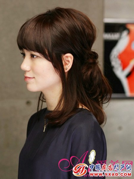 饱满的后部头发设计俨然是一款韩式发型。简单的齐刘海在职场上是必须的,给人负责和信任的安全感。