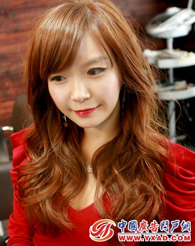 这款棕红色调的波浪卷发就比较适合30至40岁的成熟女性,优雅大方又很有时尚女人味,剪个齐刘海来中和年龄的困扰。
