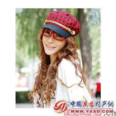 棕色的长款发一直到胸前,很漂亮的弧度,搭配红色边框的眼镜显得十分洋气,加上格纹帽子也来凑热闹了,整个造型就更加喜庆啦!