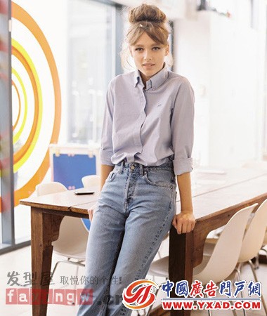 花苞头演绎清新干净的OL风格,衬衫配牛仔裤的中性搭配,干练大方