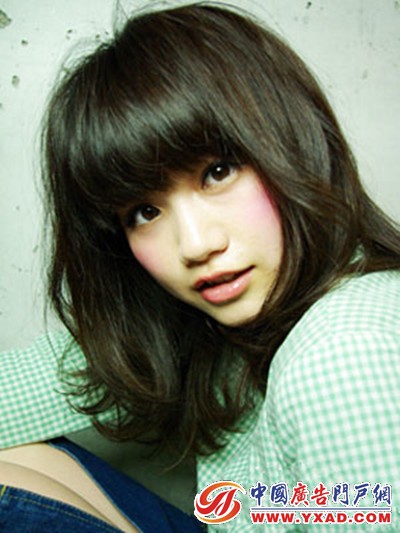 薄薄的斜刘海很好修饰了有点圆圆的脸蛋,而时尚的亚麻色发色染发,非常时尚好看的一款中长发发型喔!