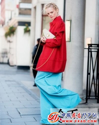 试问普通人谁会有勇气将大红搭配大蓝张扬出街?超模Hanne Gaby Odiele(汉妮·盖比·奥迪尔)告诉你,她可以!全部梳起的头发让整个精神面貌变得酷感十足也很有神采。宽松的大红色外套之下配之以亮蓝色的超宽阔脚裤,如此怪异的搭配,相信只有她才能驾驭。
