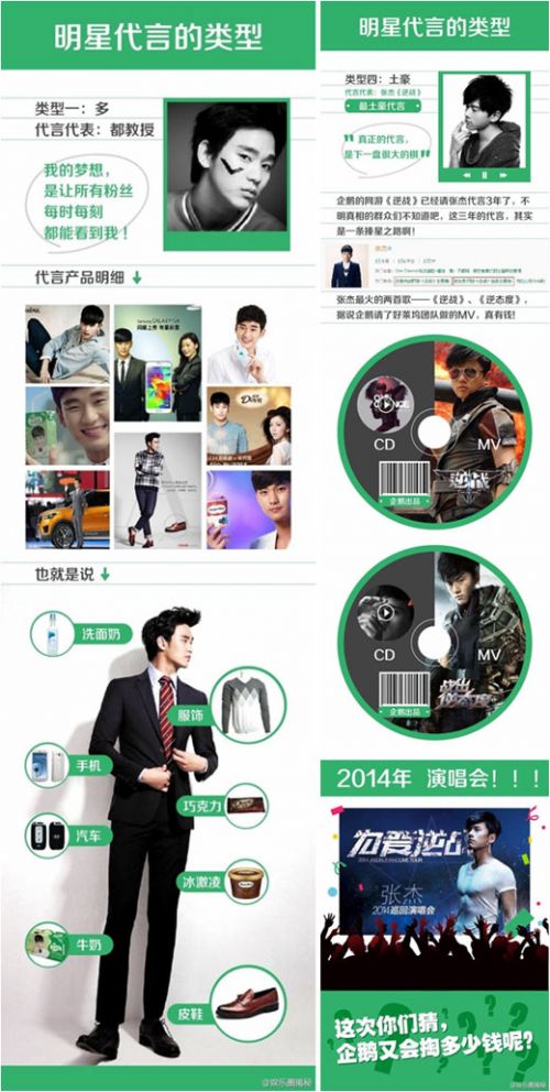 相对应的,张杰的爱情故事开始于谢娜,止步于谢娜,公众形象比较专情,广告代言也显得专一而深情。2012年,张杰开始代言网游《逆战》,与此同时,对方也不吝成本,花费重金请好莱坞团队帮助张杰打造过两首游戏主题MV《逆战》和《逆态度》,迄今为止这两首歌都是张杰最火的单曲,仅《逆态度》上线一天试听量超过5千万,这也让张杰在歌手中的地位大增。当然,张杰也是懂得“知恩图报”的,无论是《逆战》的商业活动还是大型游戏比赛,他都是极力相挺,毫不推脱。近日张杰的世界巡回演唱会命名为“为爱逆战”,赤裸裸地打上了代言商产品名称,让不少人大吃一惊。其实,这种较为“专情”的代言,对明星还是厂商,都是一场双赢。厂商在选取明星代言时,除了名气因素要考虑外,也要评估合作深度,能带来的实质价值。
