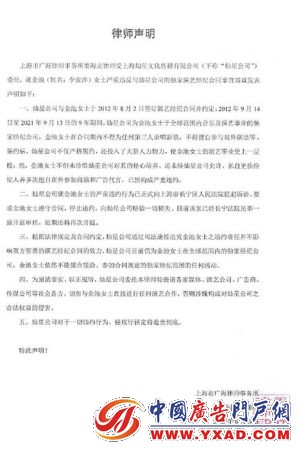 上海市广海律师事务所姜海立律师受上海灿星文化传播有限公司(下称“灿星公司”)委托,就金池(姓名:李素萍)女士严重违反与灿星公司的独家演艺经纪合同事宜郑重发表声明如下: