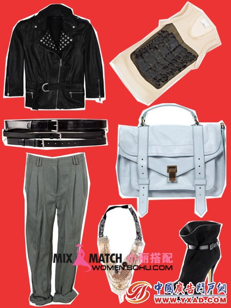 搭配建议:黑色短款夹克劲酷有型,下配翻边西装裤,瞬间精明干练的都市女郎。机车包和及踝靴更舔新意。