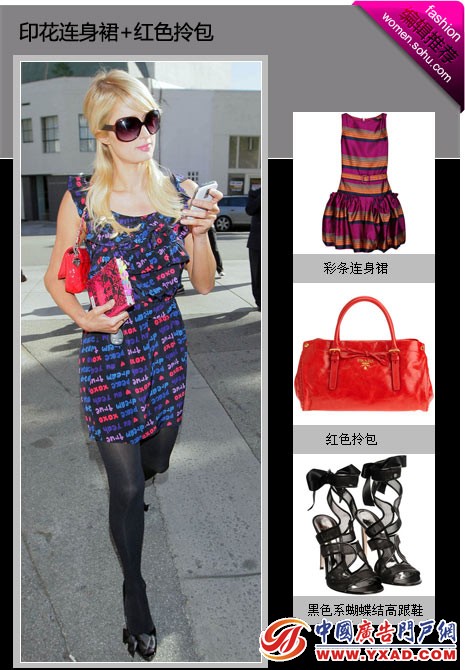搭配建议:彩色字母印花连身裙靓丽可爱,桃红花案与小挎包、笔记本及粉唇妆相呼应,整体抢眼又出位。黑色系蝴蝶结高跟鞋很有味道。