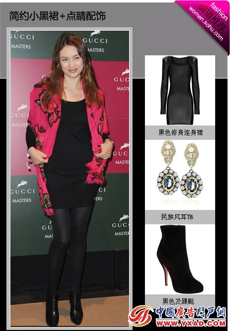 搭配建议:黑色修身连衣短裙搭配黑色丝袜和黑色踝靴,整一“黑寡妇”上证,不过瑰涂鸦围巾做披肩点睛打破这一沉闷格局。