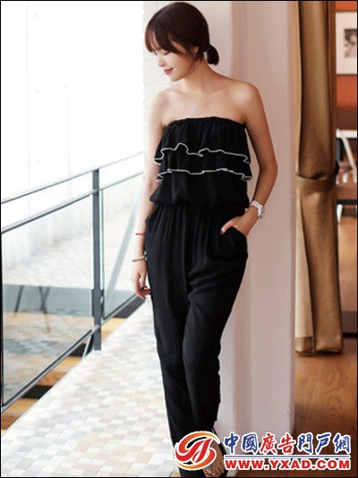 抹胸设计展现完美的双肩和锁骨线条。黑色给人稳重端庄的印象。胸部双层的荷叶边设计增强层次感,哈伦裤的宽松设计遮盖大腿的赘肉,休闲又时尚。